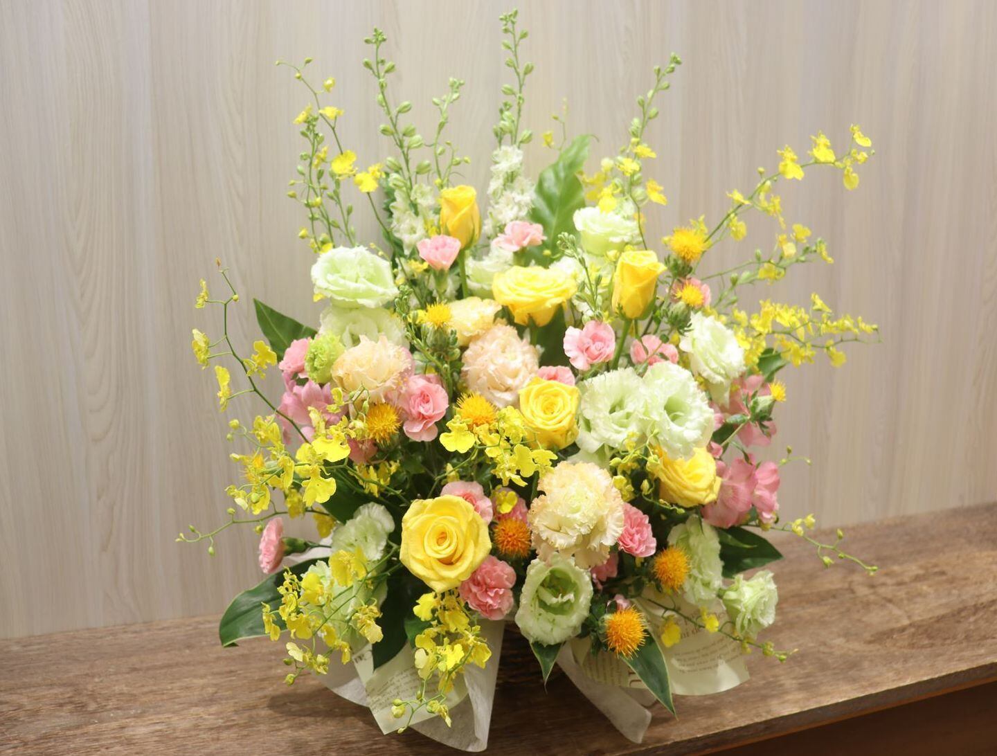 ご退職や異動のお祝い、式典や公演、展示会などお勧め華やかなイエロー系お花を使ったアレンジです。 お花はイエローのバラやトルコキキョウ、ピンクのスプレーカーネーション、オンシジューム、季節のお花、グリーンを使ってプロのスタッフが制作いたします。