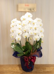 大輪白の胡蝶蘭で茎が3本で仕立てれた商品です。蕾も含め30~33輪クラスの胡蝶蘭です。地元の信頼できる生産者さんからご注文を戴いてから仕入れを行っています。価格にはラッピング代・立て札・配達料が含まれています。 贈り先様や目的に合わせラッピングいたします。法人様関係はネイビーのラッピングがお勧めです。