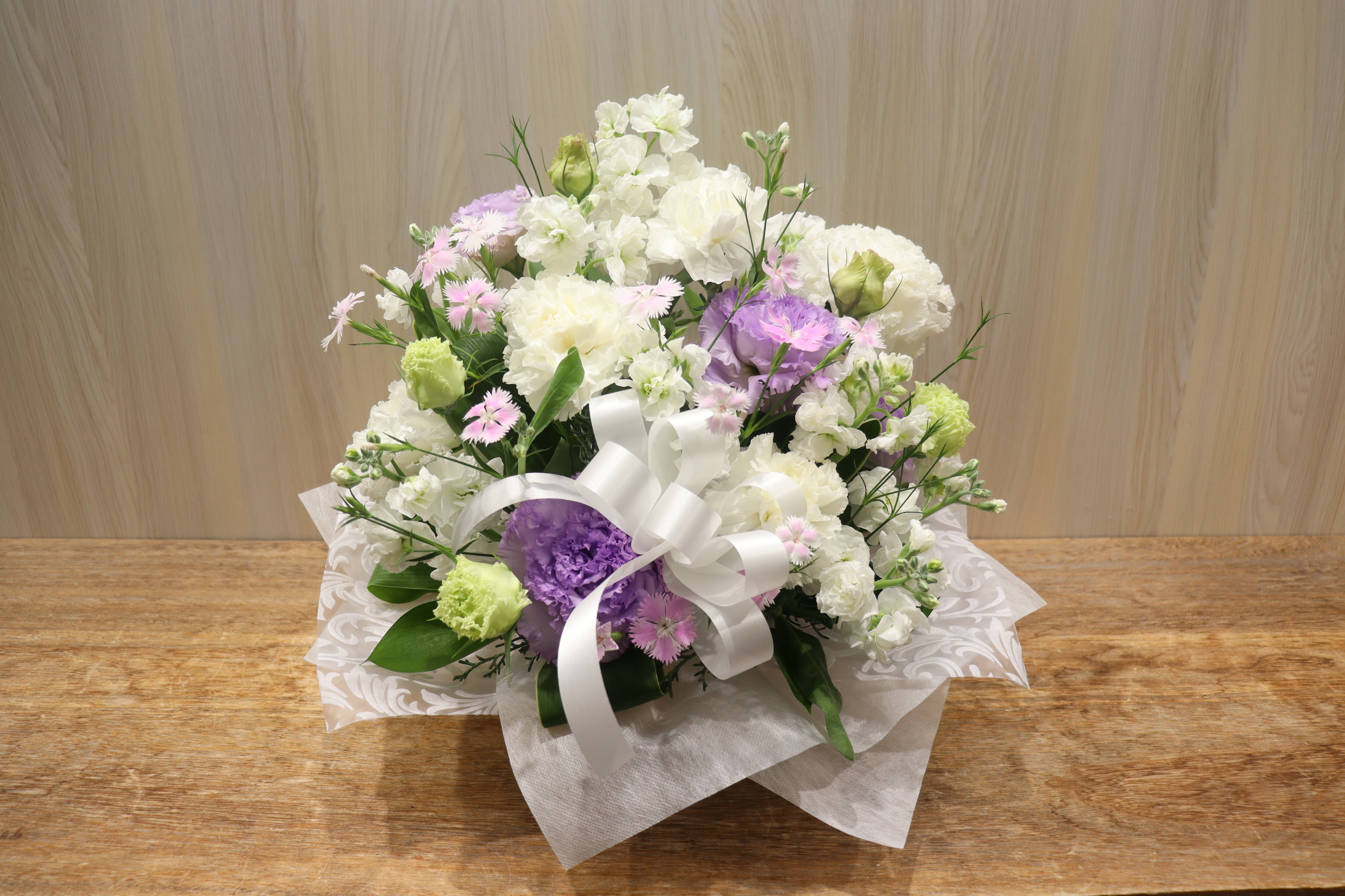 白やパープルのお花で上品な雰囲気のお供えアレンジをプロのスタッフがお作りします。 白とパープルのトルコキキョウ、カーネーション、季節の花材などでお作りしています。