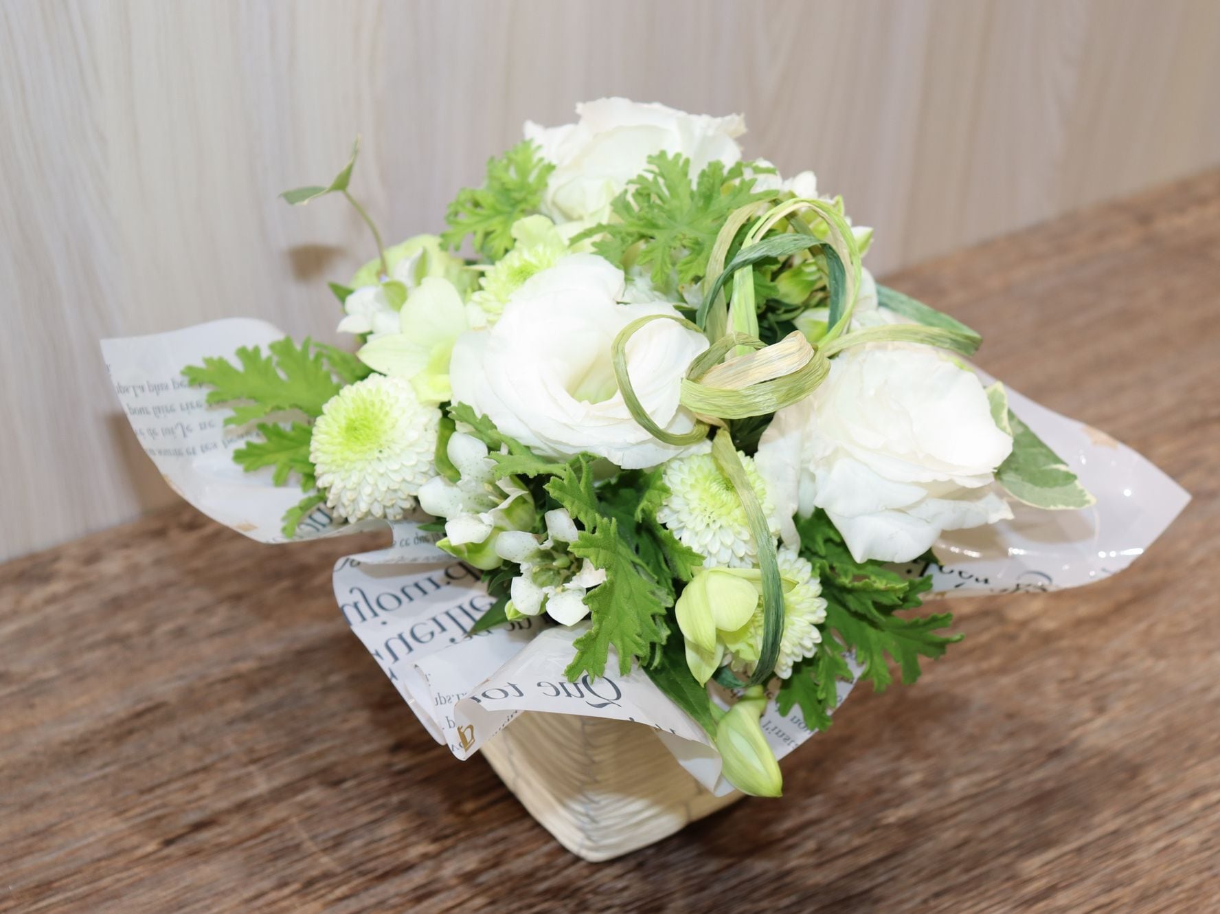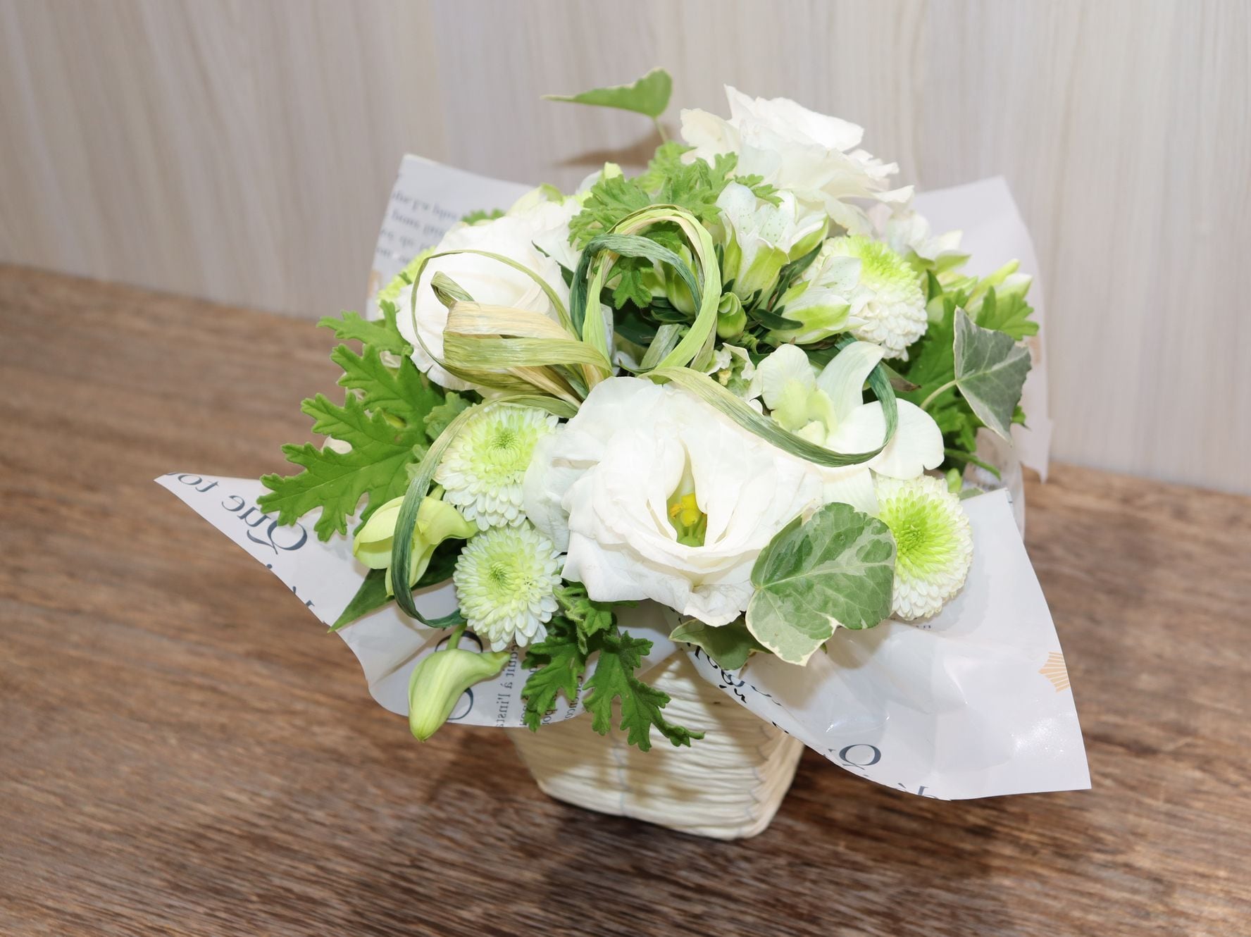 飼い主さんの悲しみを癒し、ペットちゃんへの想いを伝えられるお供えアレンジです。 トルコキキョウ、スプレーマム、アイビーなどのグリーンを使ってプロのスタッフがお作りします。