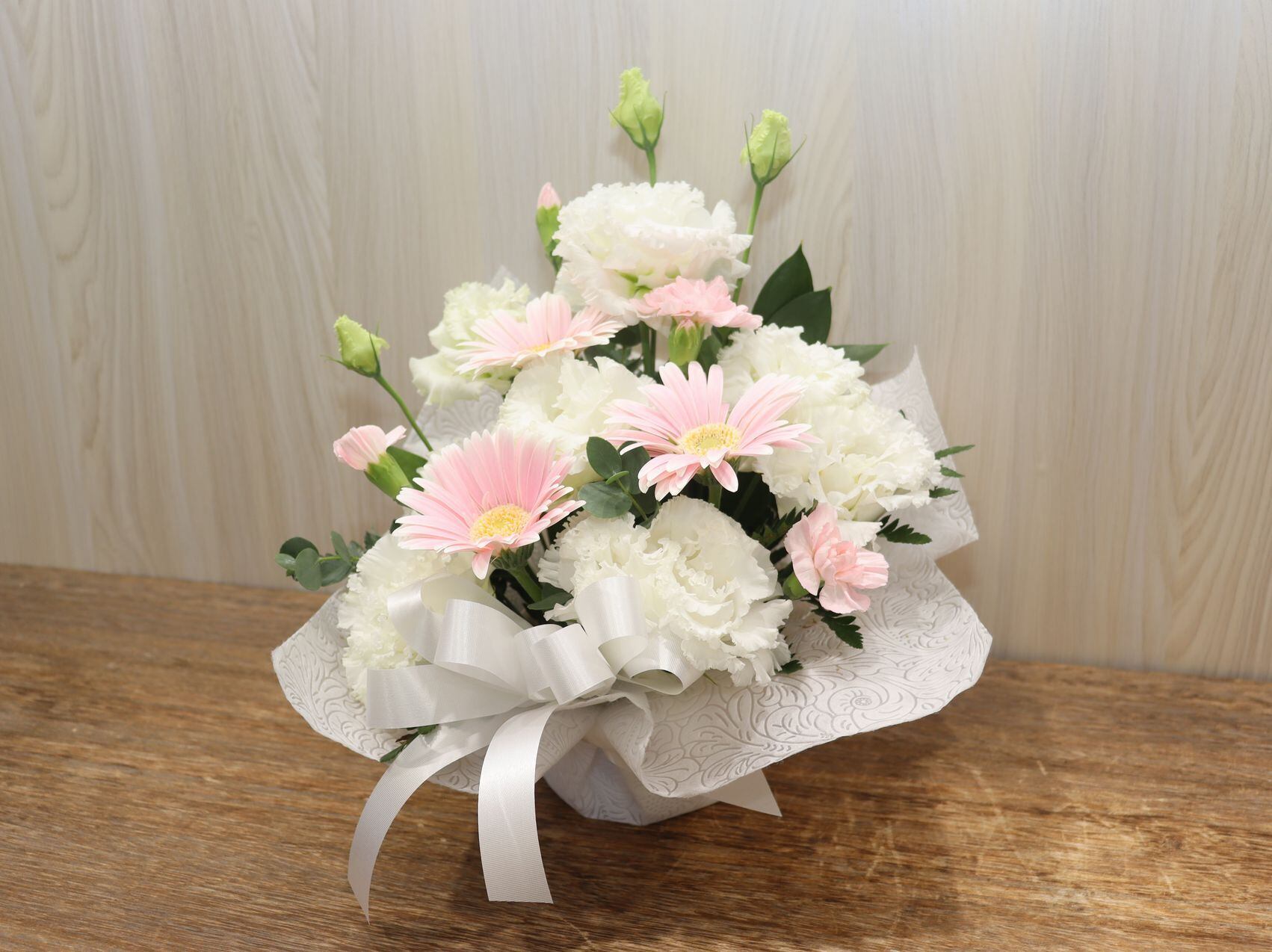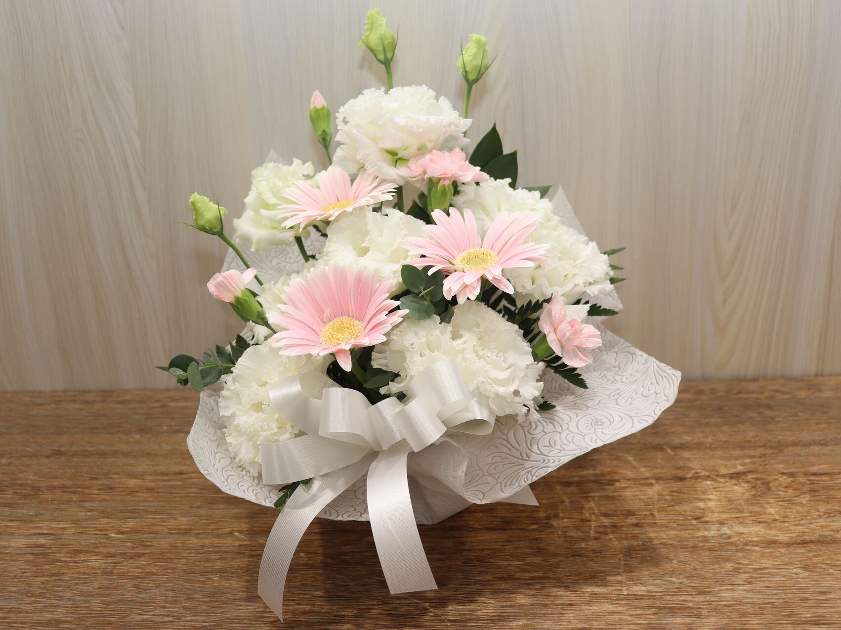 飼い主さんの悲しみを癒し、ペットちゃんへの想いを伝えられるお供えアレンジです。 白のトルコキキョウ、淡いピンクのガーベラ、その他季節の花材やグリーンなどでプロのスタッフがお作りいたします。