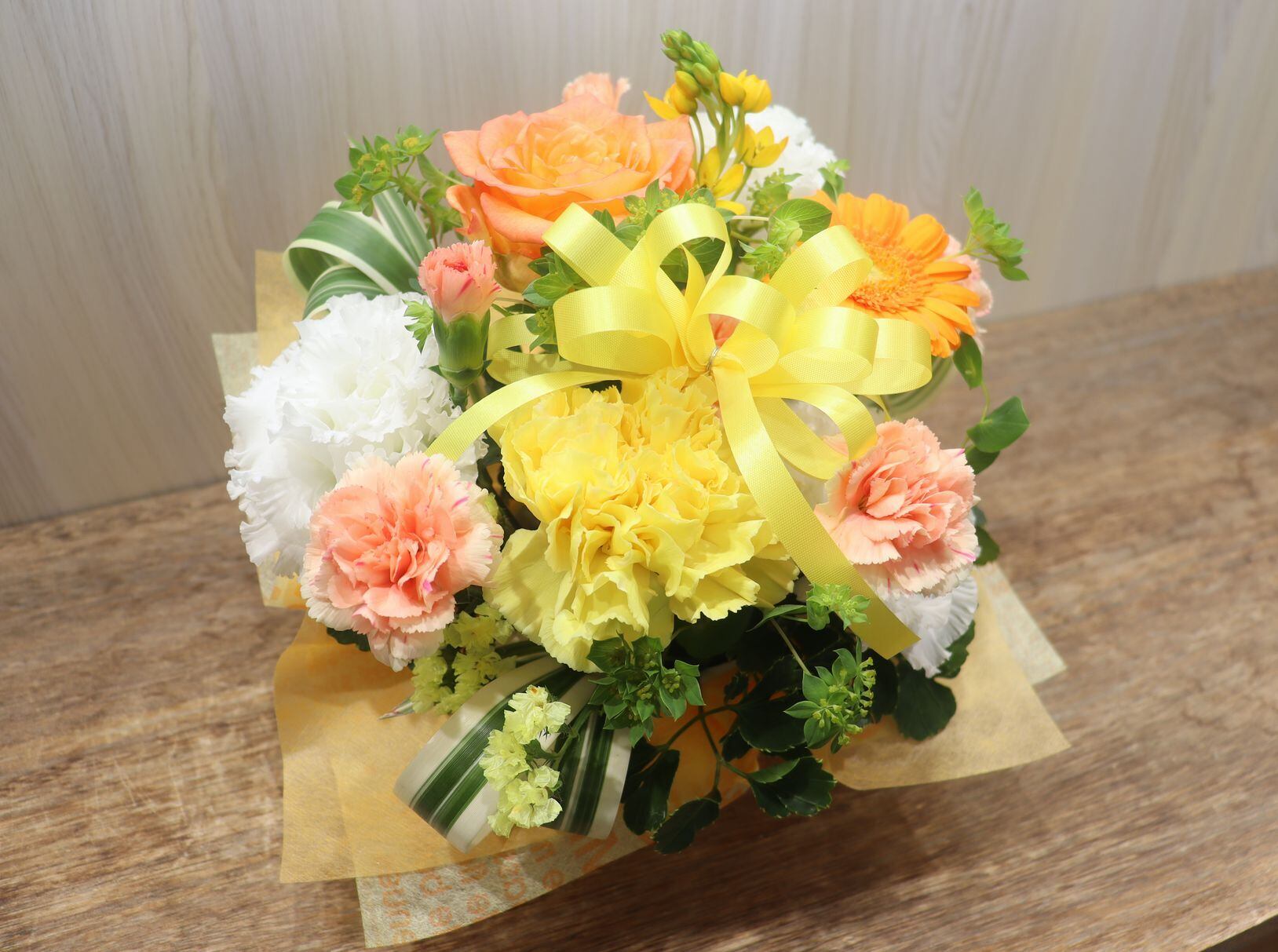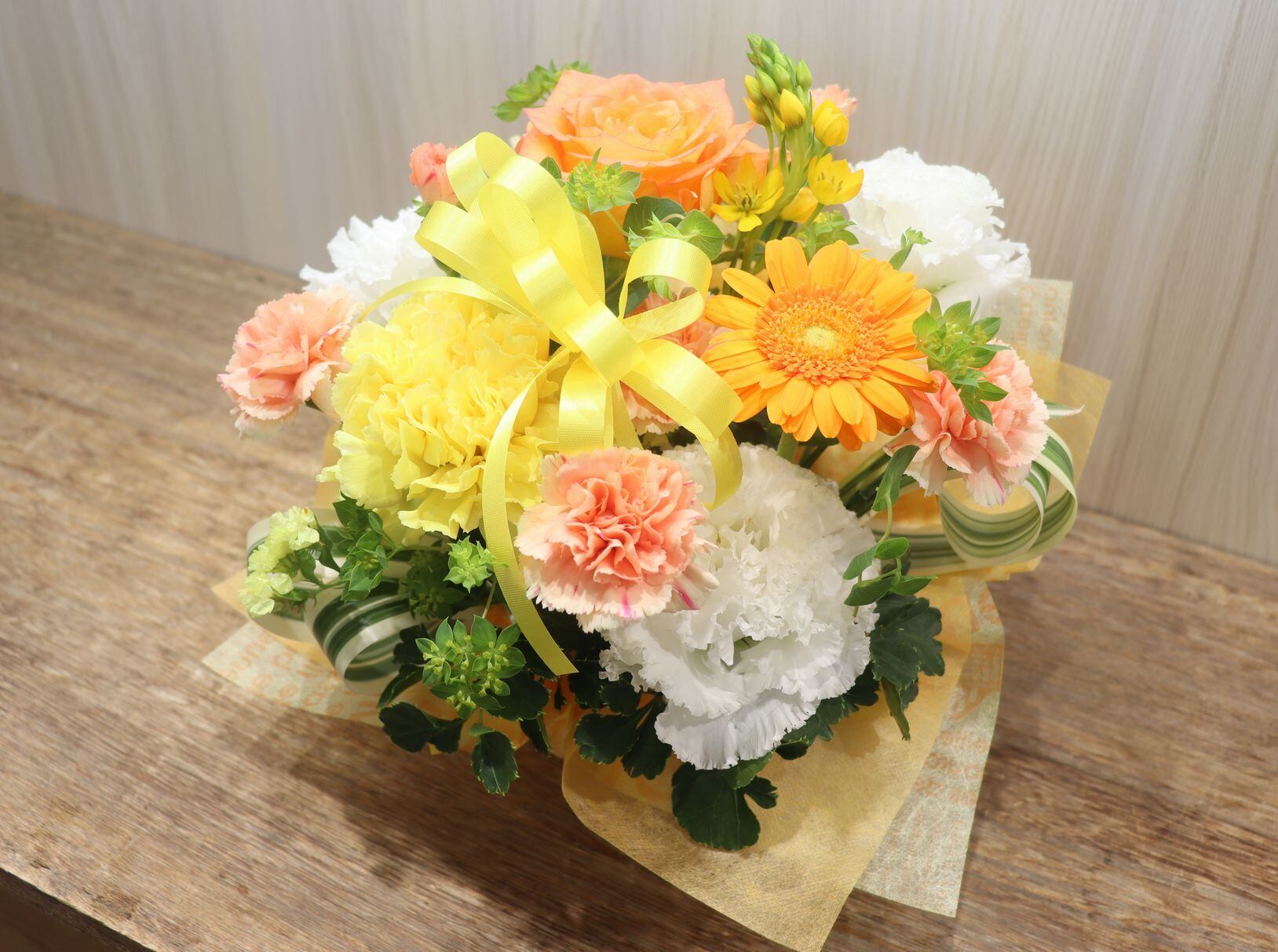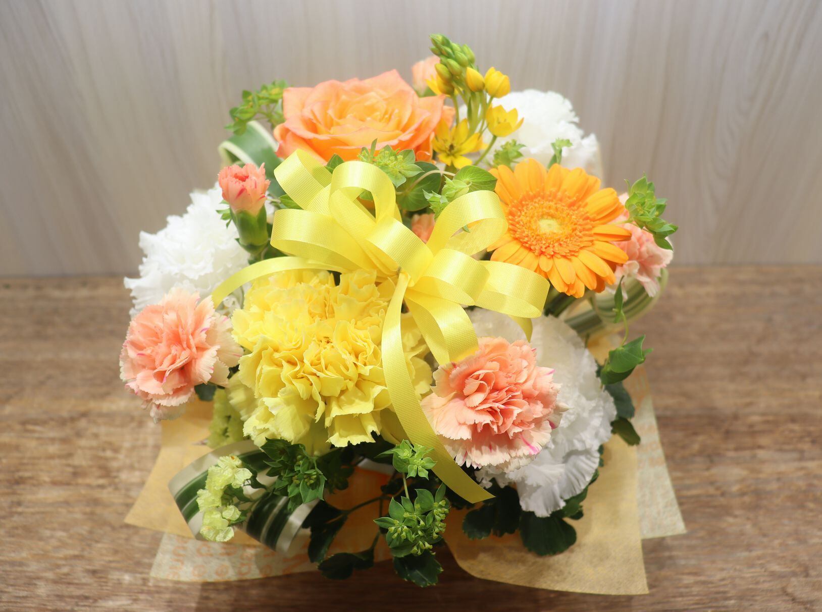 飼い主さんの悲しみを癒し、ペットちゃんへの想いを伝えられる明るいイメージのお供えアレンジです。 お花はイエローのガーベラ・スプレーカーネーション、オレンジのカーネーションの他、季節のお花、グリーンで制作いたします。