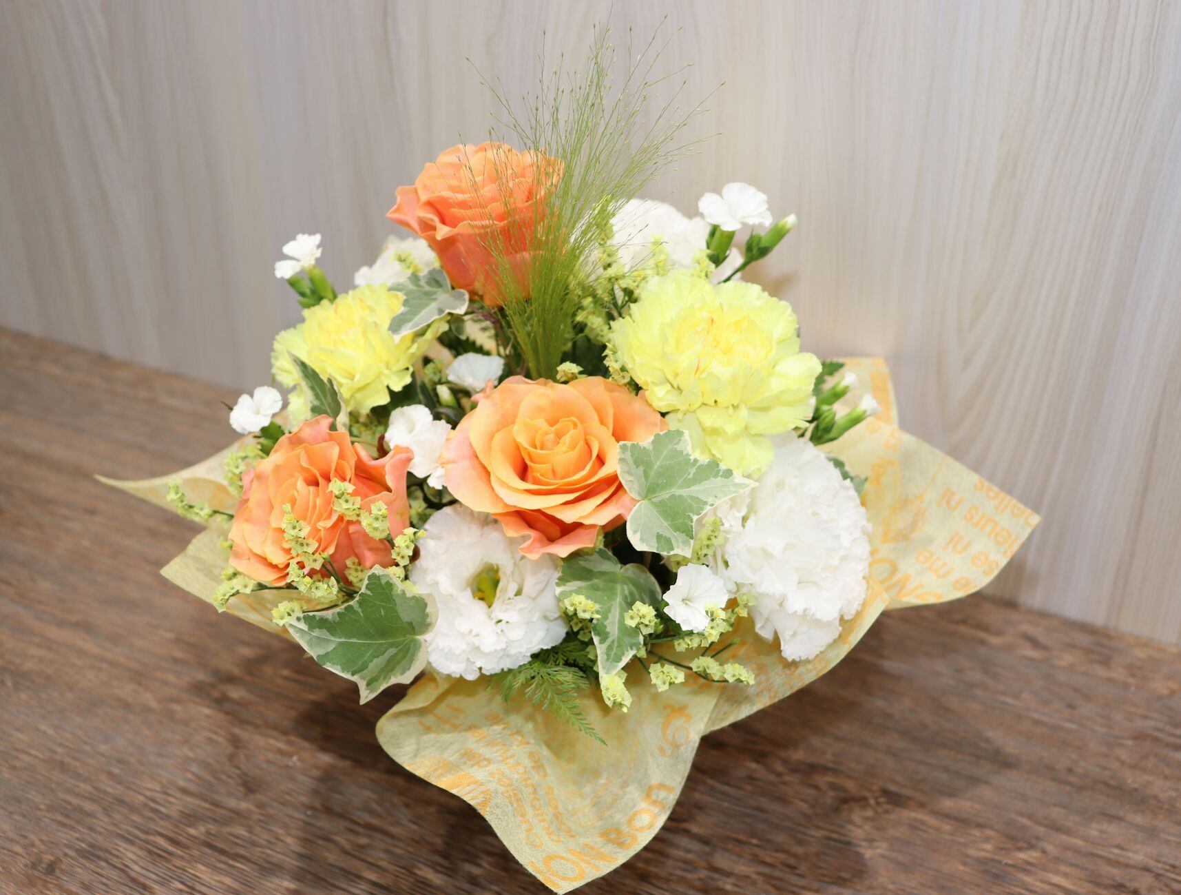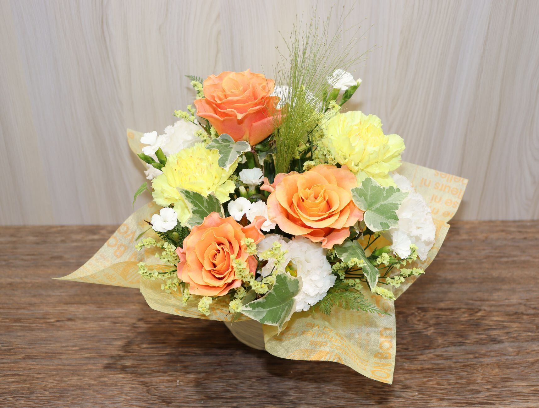 お誕生祝いや結婚記念日など、記念日のプレゼントやお祝いにお勧め黄色オレンジ系のお花を使ったアレンジです。 お花はオレンジのバラや黄色カーネーション、季節のお花、グリーンを使ってプロのスタッフが制作いたします。