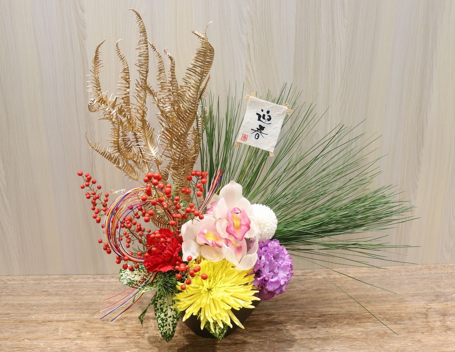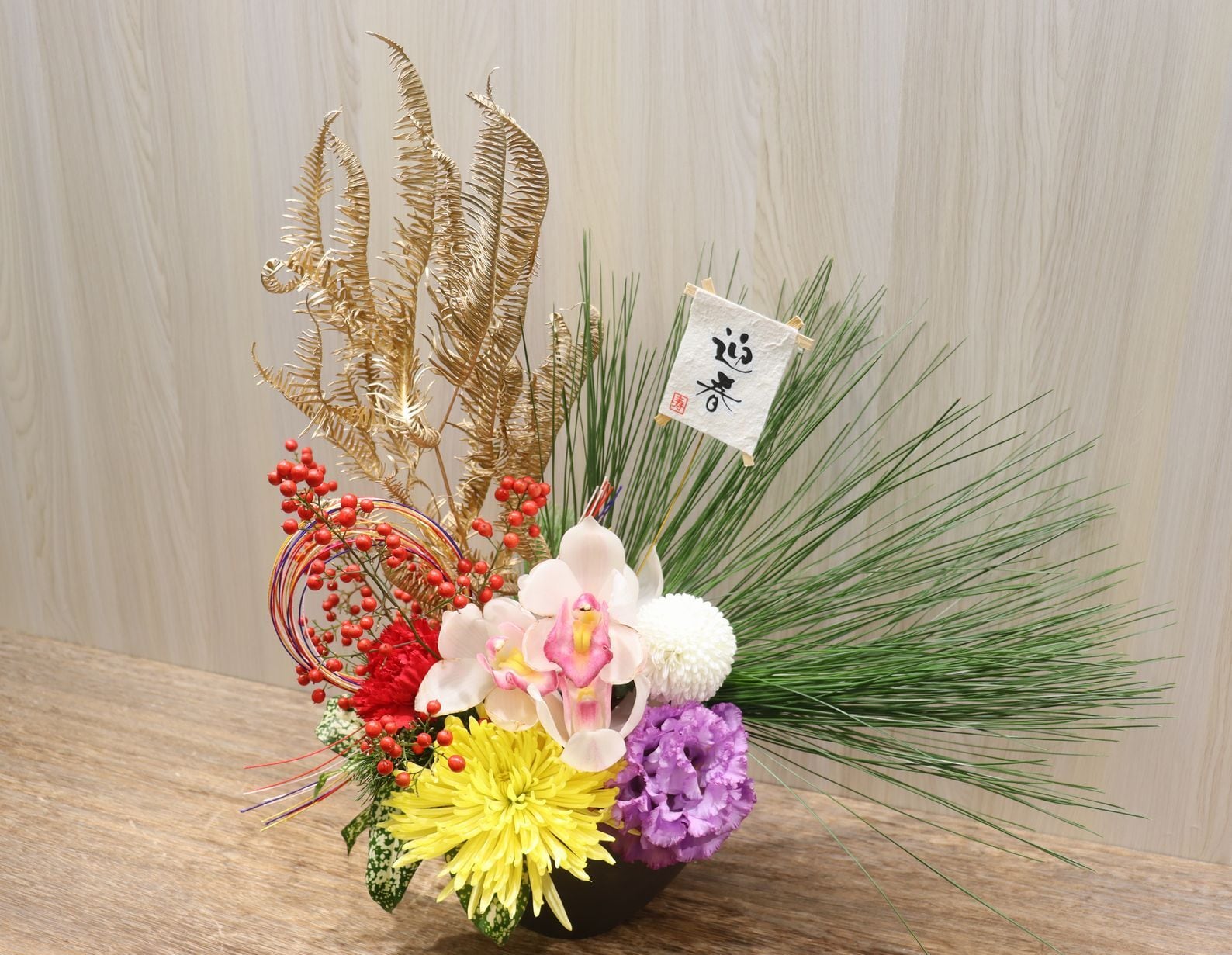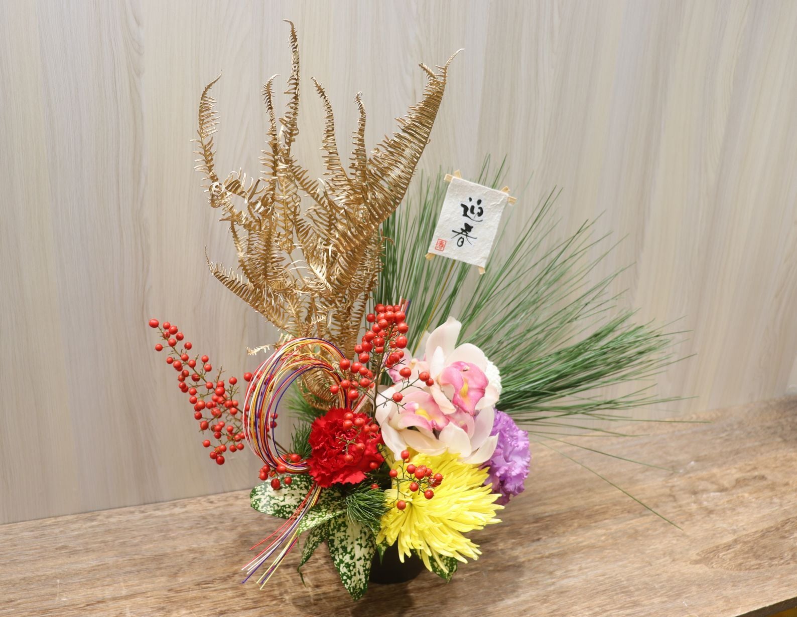 迎春アレンジで玄関やリビングに華やぎを飾ります。和モダンな雰囲気で、玄関やリビングを華やかな雰囲気にするお正月アレンジです。身も心も新たに新年をお迎えください。