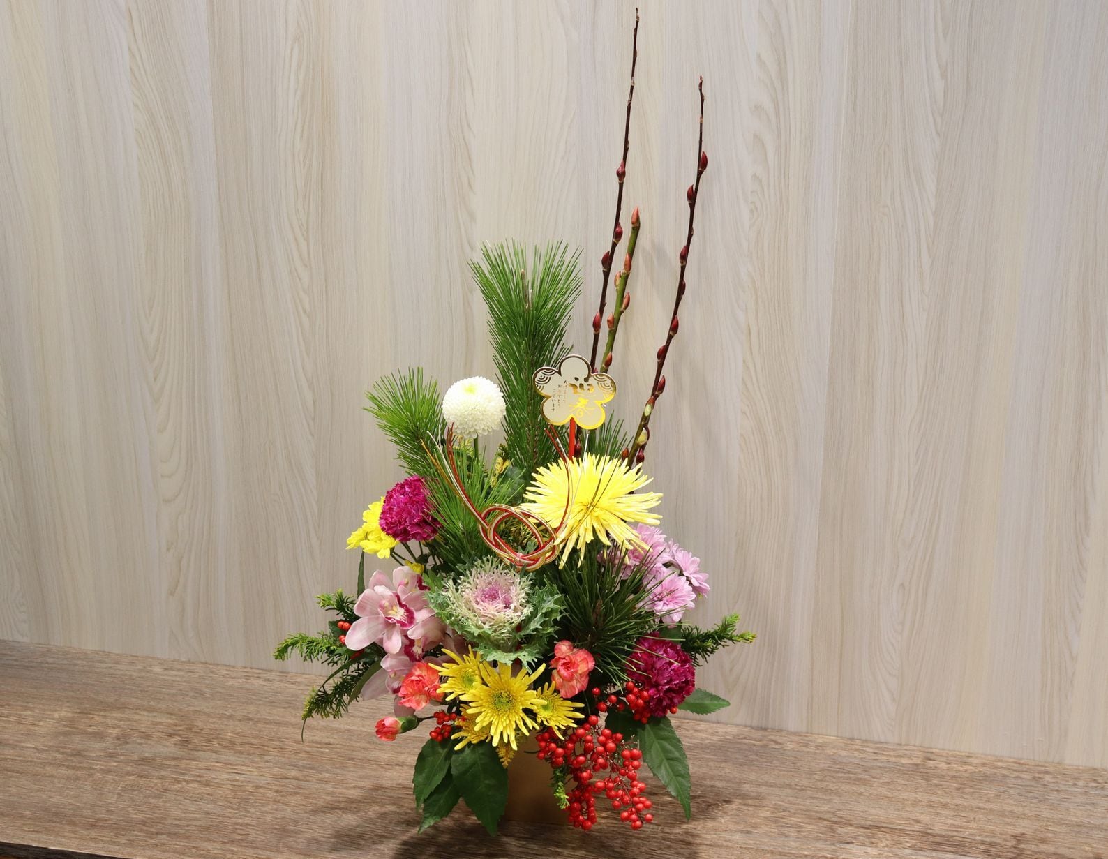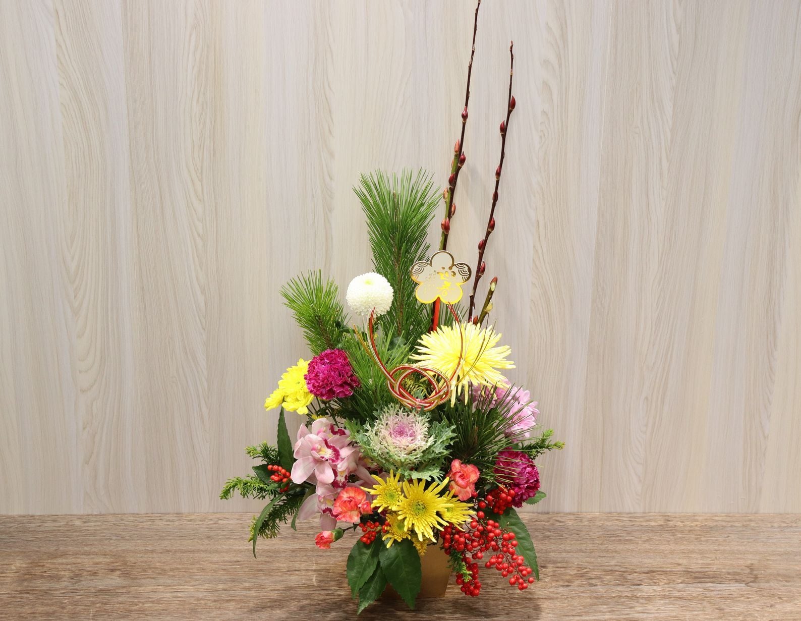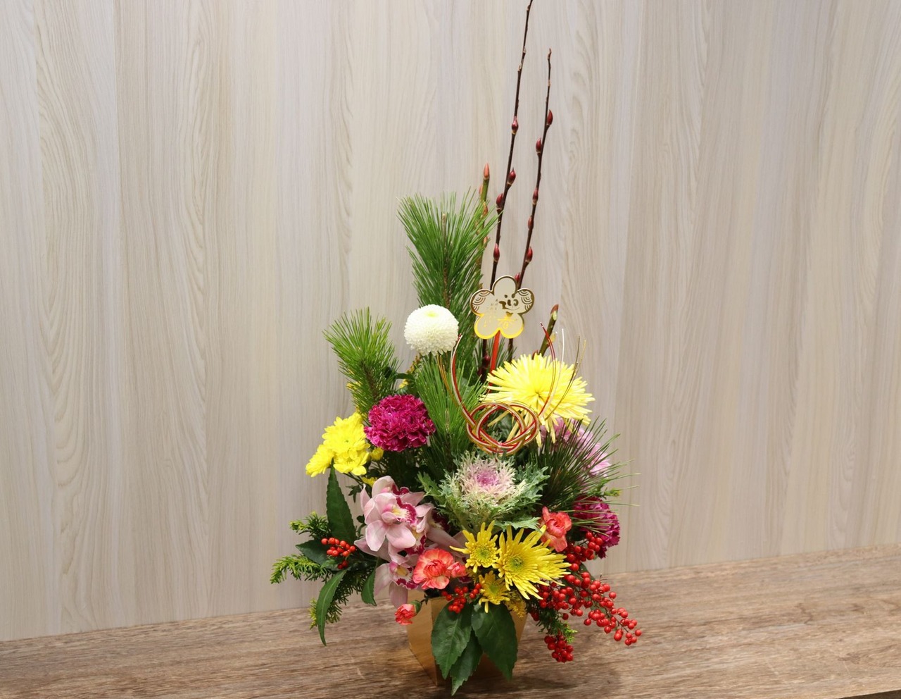 迎春アレンジで玄関やリビングに華やぎを飾ります。和モダンな雰囲気で、どんなお部屋にもマッチします。玄関やリビングに気軽に飾れる門松風アレンジメントで、身も心も新たに新年をお迎えください。