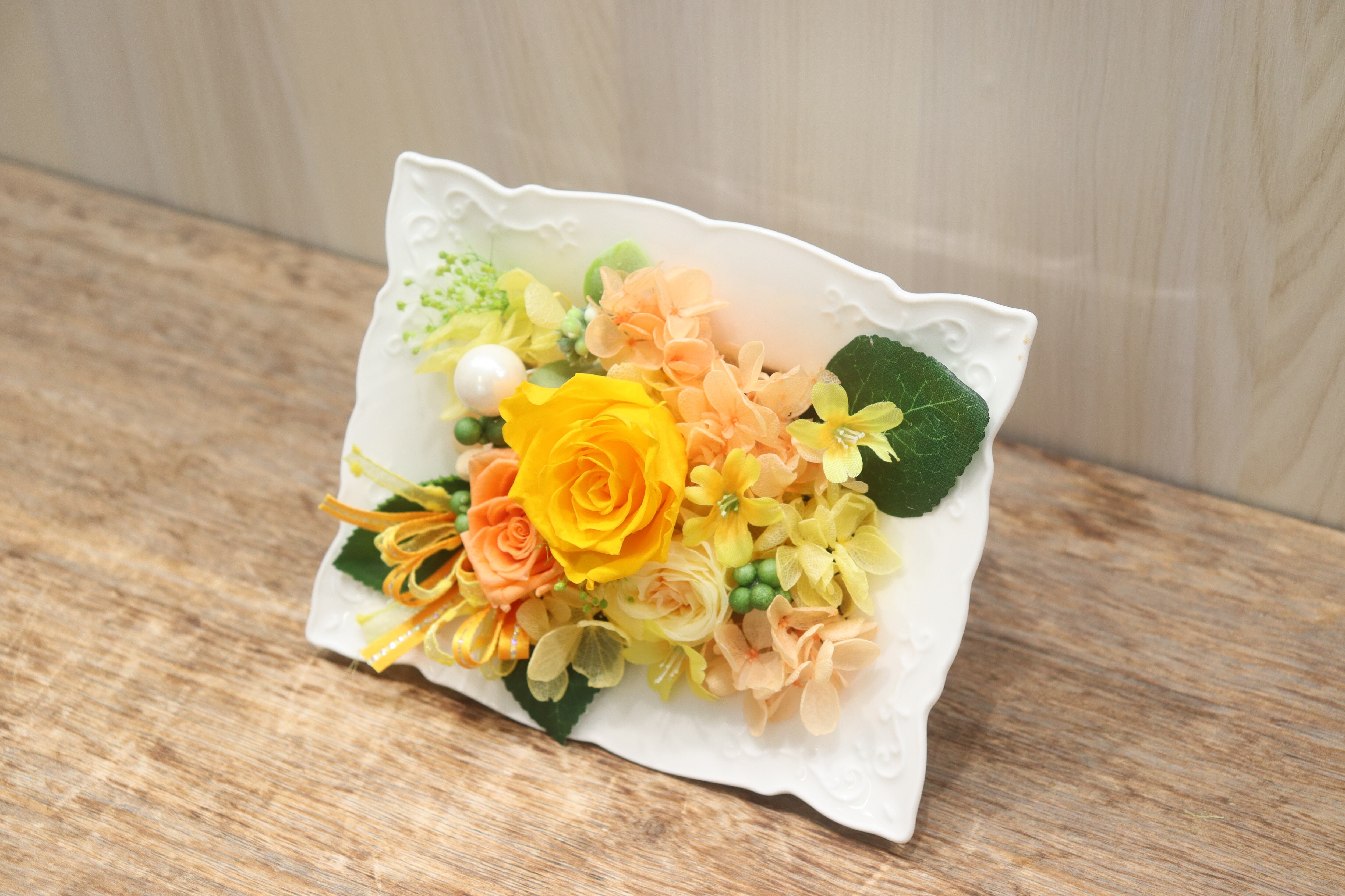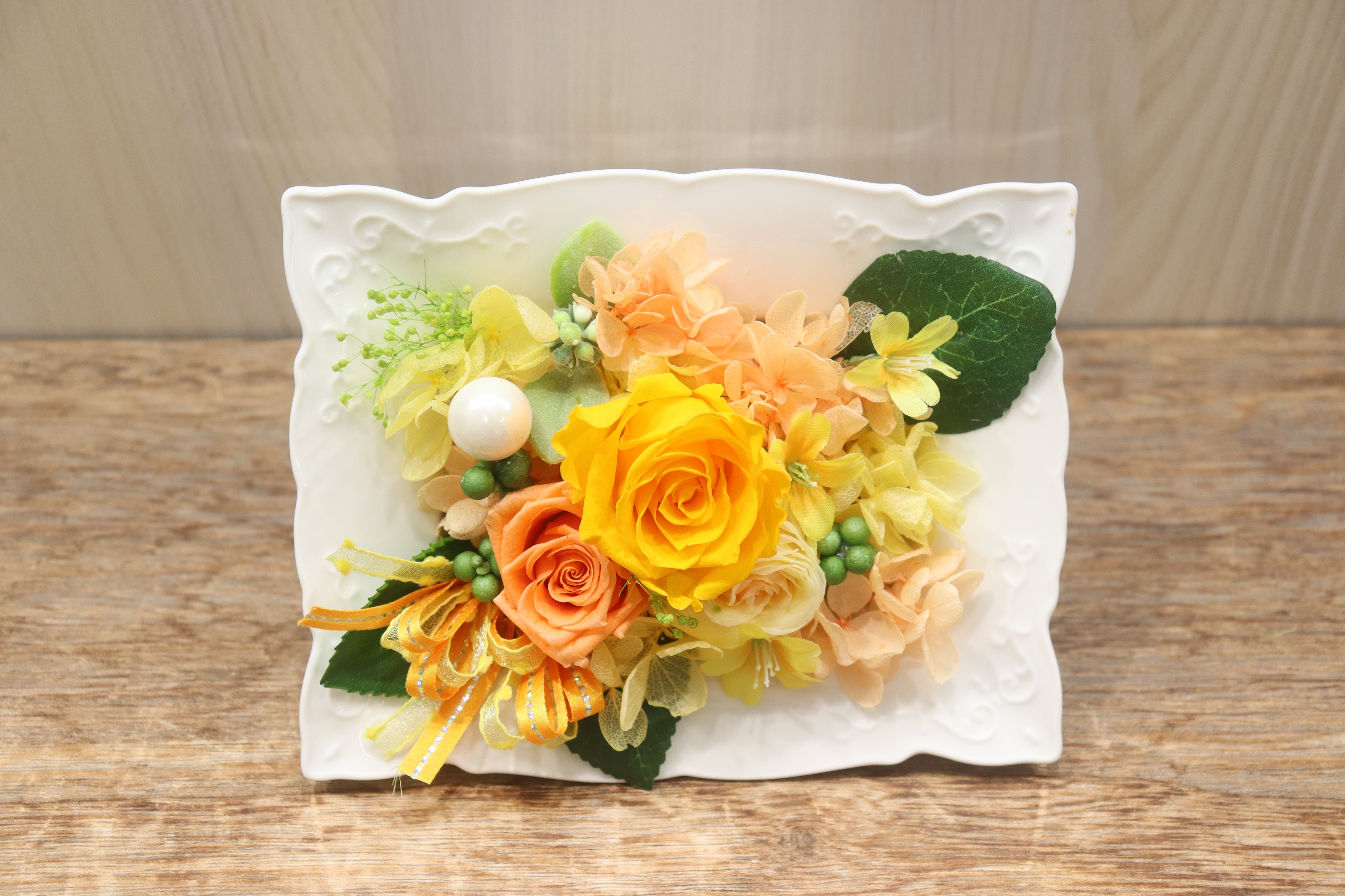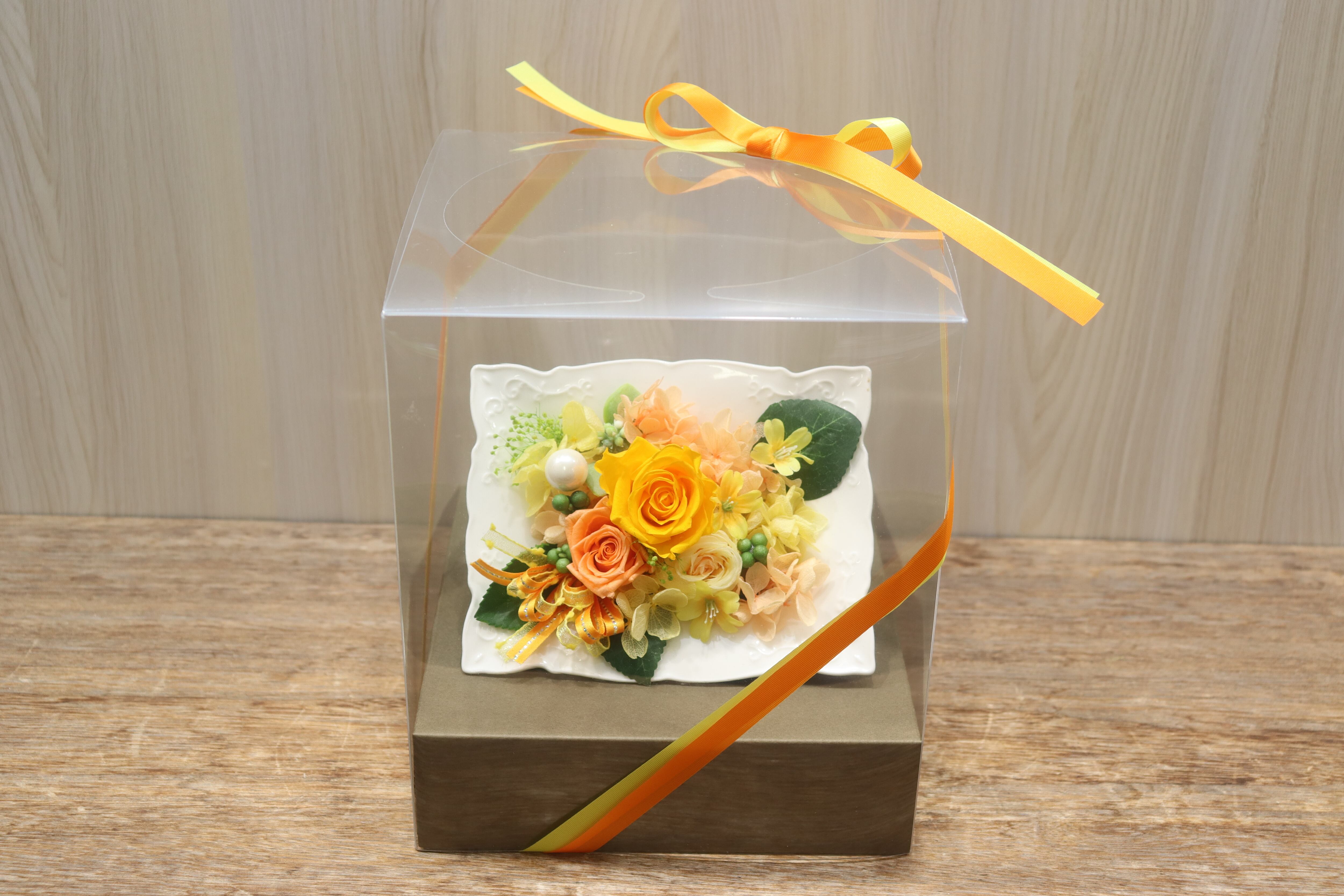 お誕生祝いや結婚記念日など、記念日のプレゼントにお勧めのイエロー・オレンジ系プリザーブドフラワーです。 イエロー・オレンジ系のバラ、あじさいやグリーン花材を使っており、高級感のあるプリザに仕上げました。 クリアケース入りですので、綺麗な状態で長く飾っていただける商品です。