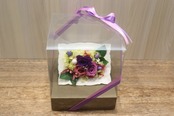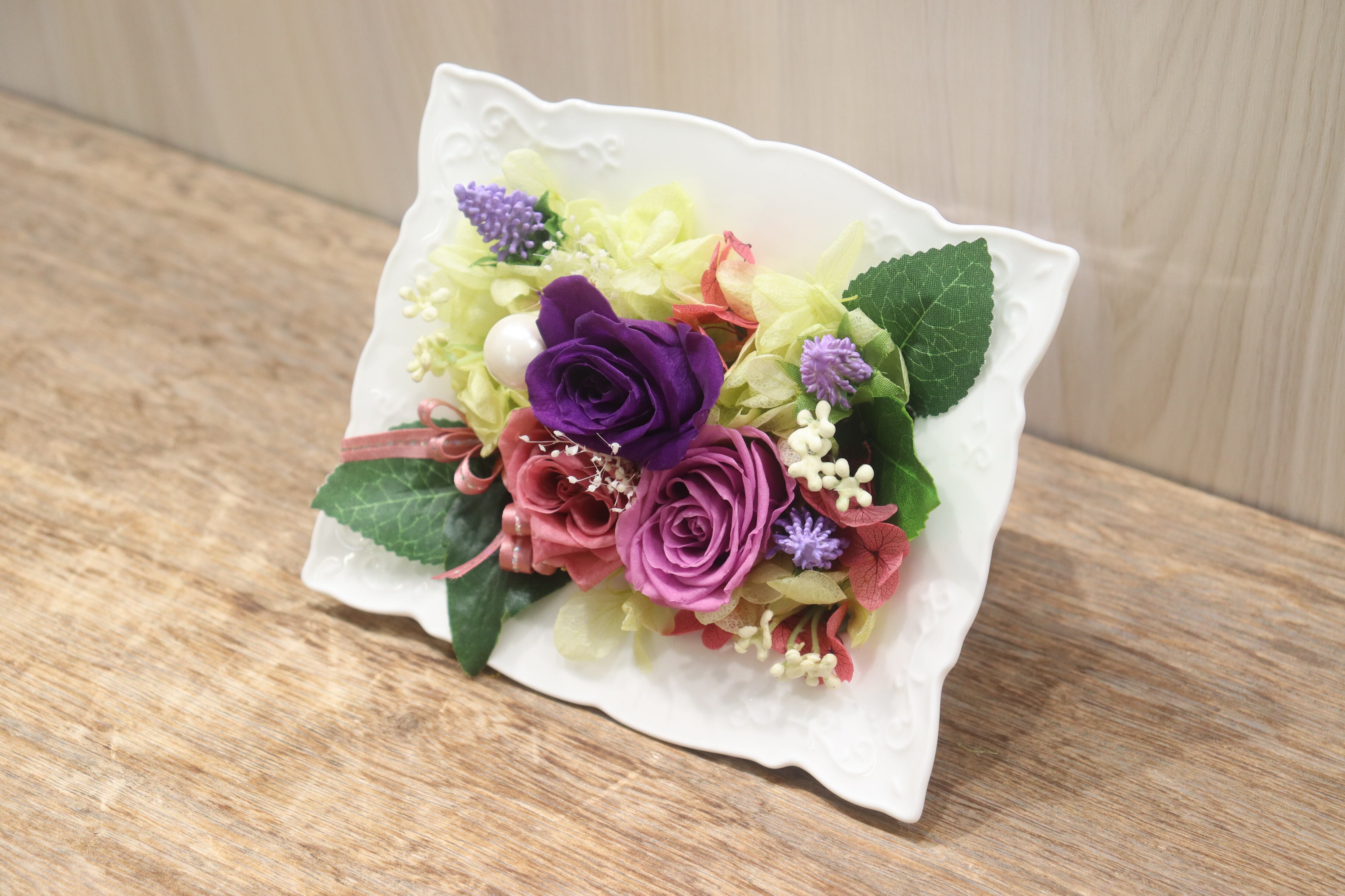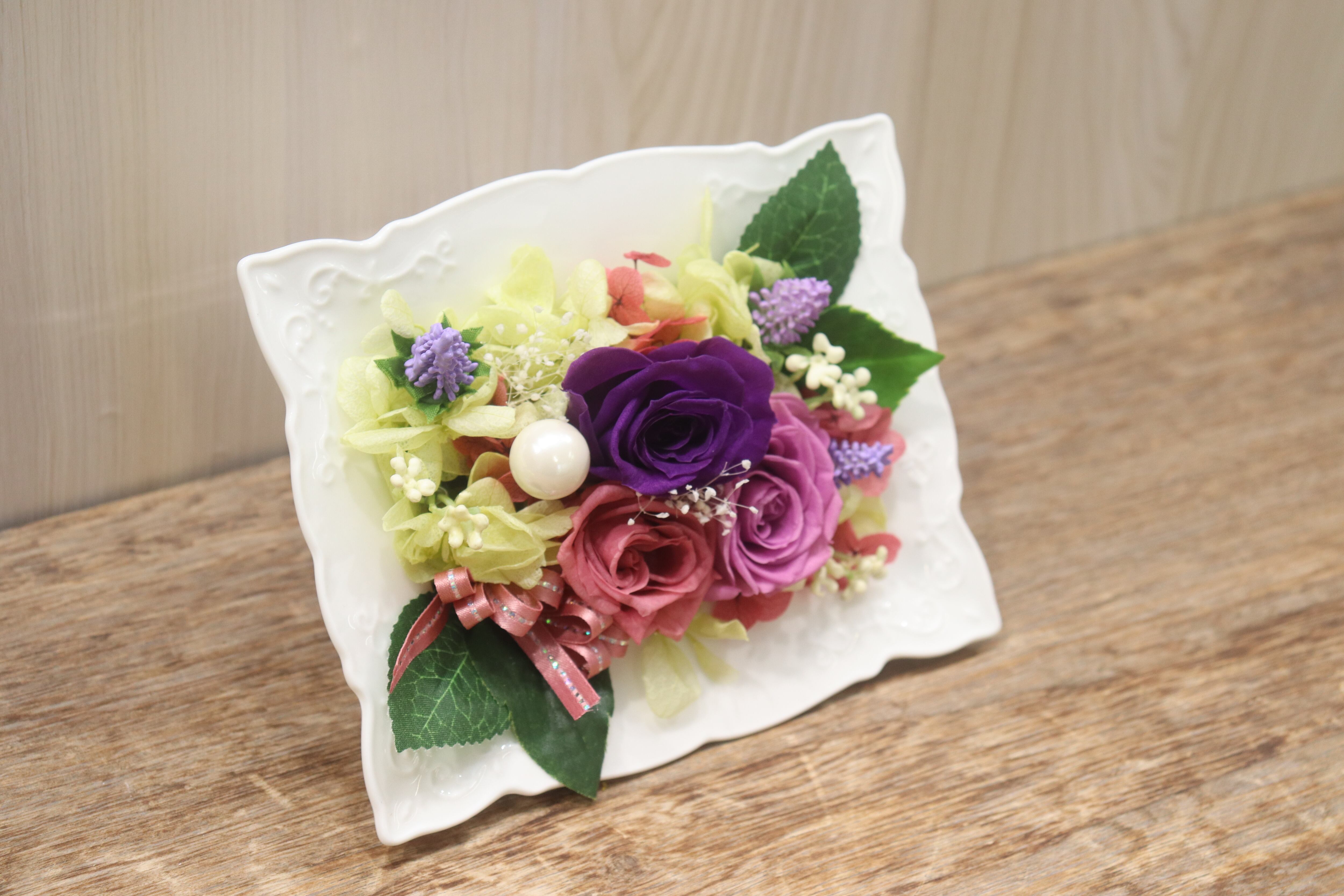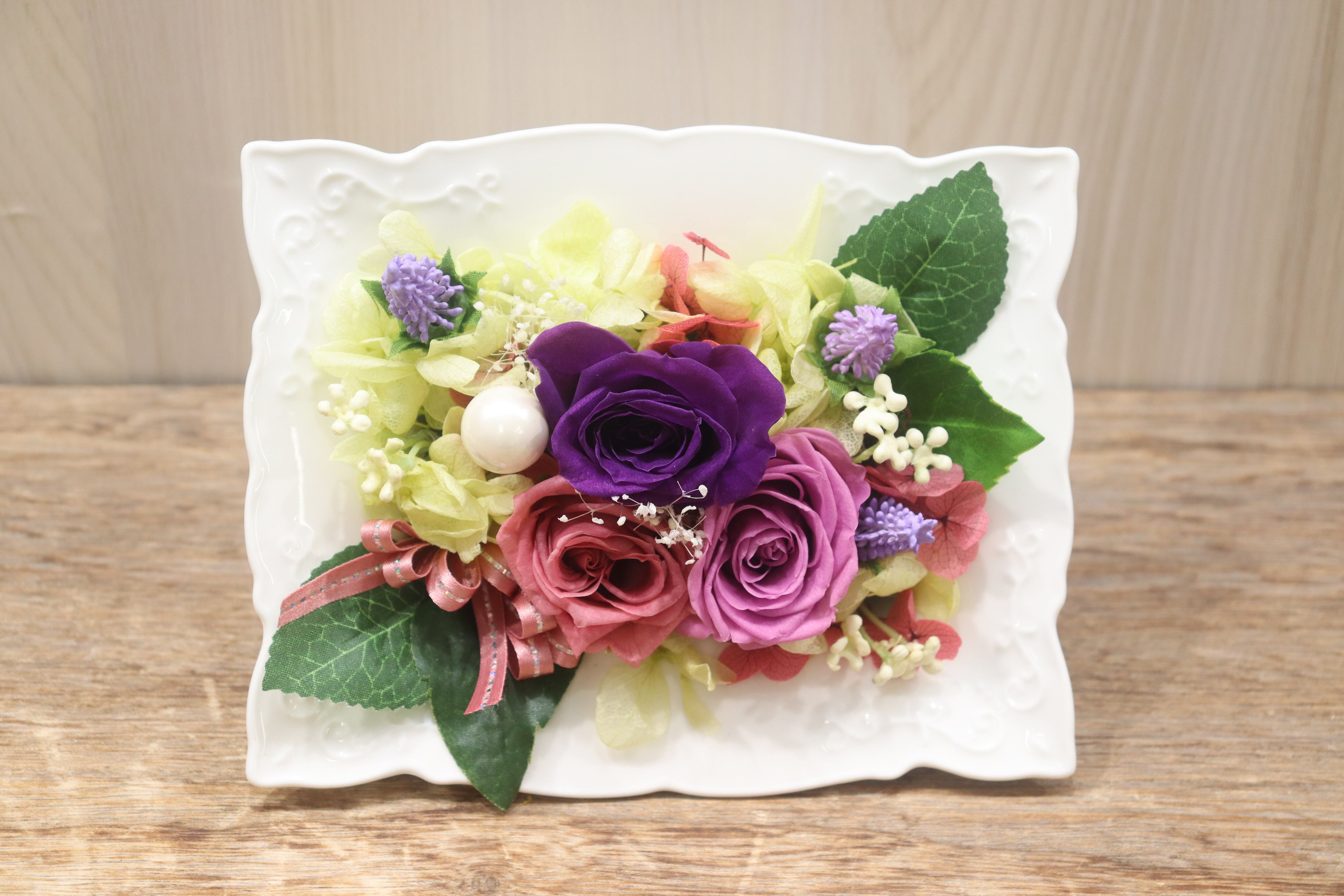 お誕生祝いや結婚記念日など、記念日のプレゼントにお勧めのパープル系プリザーブドフラワーです。 パープル系のバラ、あじさいやグリーン花材を使っており、高級感のあるプリザに仕上げました。 クリアケース入りですので、綺麗な状態で長く飾っていただける商品です。