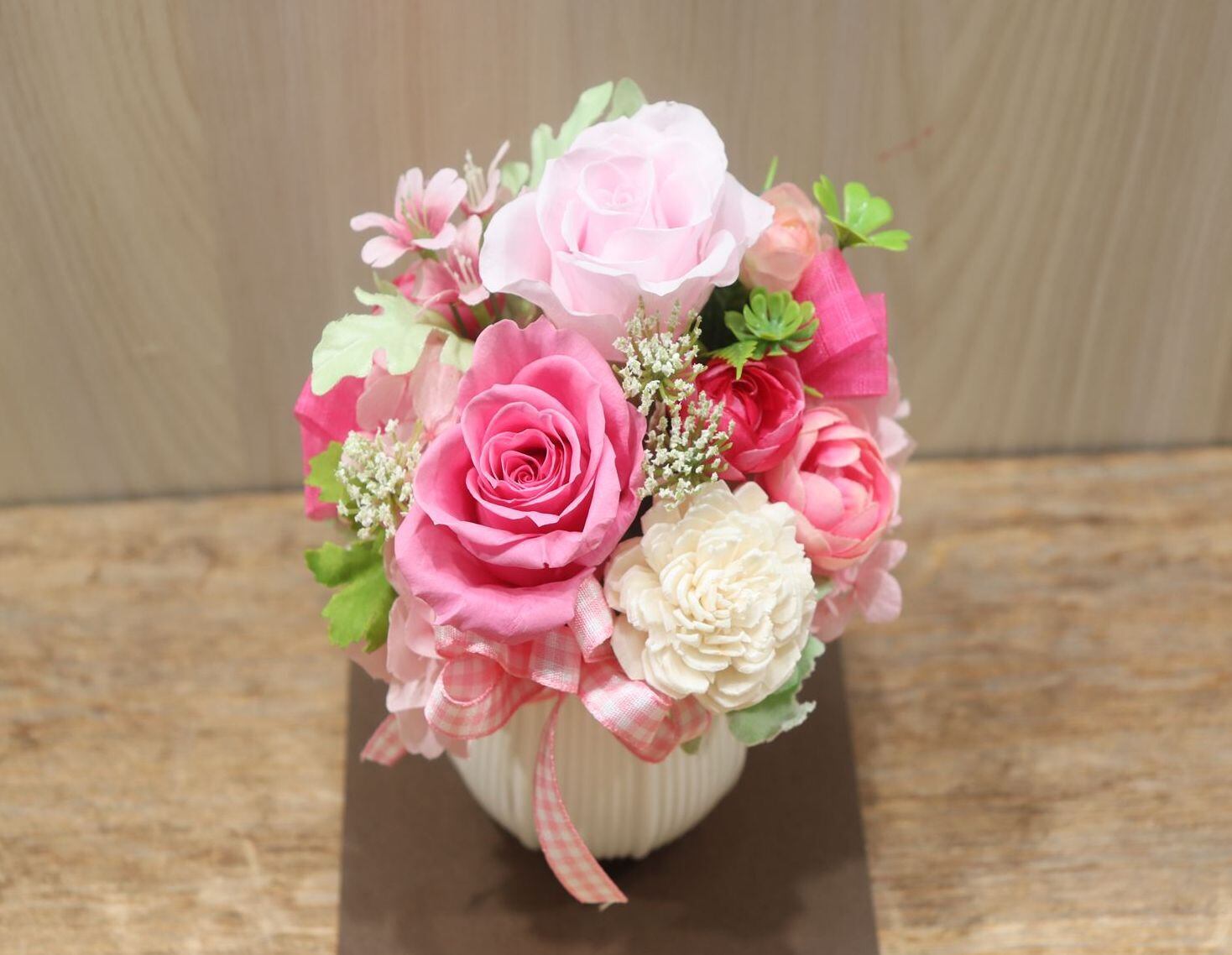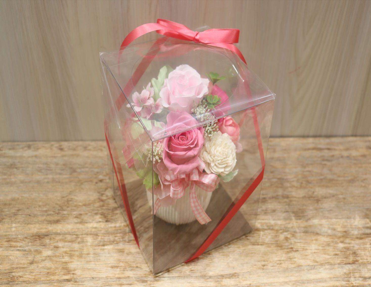 お誕生祝いや結婚記念日など、記念日のプレゼントにお勧めのピンク系プリザーブドフラワーです。 当店スタッフがピンク系のバラやあじさい・ラナンキュラスなどを使って手作りしています。 クリアケース入りですので、綺麗な状態で長く飾っていただける商品です。 夏場など暑い時期などにプレゼントする商品としてお勧めです。